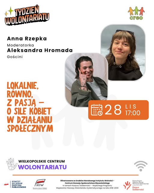 Już w piątek, 28 listopada, w godz. 17:00–19:00 zapraszamy na spotkanie online, podczas którego porozmawiamy o sile sprawczej kobiet w działaniach społecznych — tych lokalnych, oddolnych i tych, które zmieniają sposób myślenia o równości i zaangażowaniu.