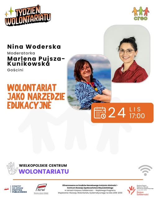 Projekt „Wielkopolskie Centrum Wolontariatu – regionalne Partnerstwo dla Wolontariatu” jest sfinansowany ze środków Narodowego Instytutu Wolności – Centrum Rozwoju Społeczeństwa Obywatelskiego w ramach Korpusu Solidarności – Rządowego Programu Wspierania i Rozwoju Wolontariatu Systematycznego na lata 2018–2030.