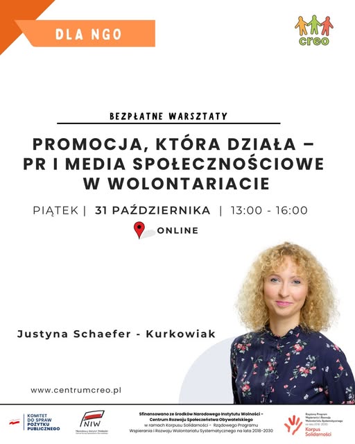 Warsztat poprowadzi: Justyna Schaefer – Kurkowiak , od 20 lat związana z sektorem pozarządowym. Na co dzień pracuje w Stowarzyszeniu Centrum PISOP. Jest także prezeską zarządu Fundacji Niwa Edukacji i Rozwoju i Fundacji Pełny Kurnik. Jest specjalistką ds. komunikowania i budowania partnerstw.